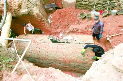 福州市考古队相关负责人告诉记者,省、市联合考古队10月24日进场清理。因古墓边上就是化粪池,墓室溢入粪水,充满毒气,发掘工作困难重重。在先用消毒剂消毒后,工作人员戴好防护面罩,蹲在墓室内一点点把淤泥清出去。