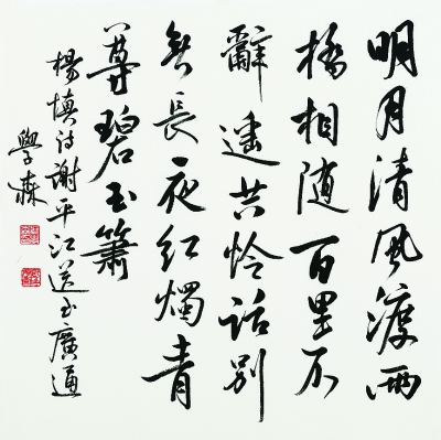 大学教学、科研之重任并未磨灭何学森的诗心灵性,他发表了一系列文化艺术散文。《江上愁心千叠山》既解析中国画,也抒发作者逍遥林泉的心怀;《闻道长安似弈棋》是写围棋,却引申发挥人生的境界和智慧。惟其如此,何学森的书法作品乃能始终流溢着浓浓的书卷气息,格调清新、纯正、儒雅、温醇。何学森书法的笔触生动,恰如他发表的美文一样,带给我们丰富的审美享受。