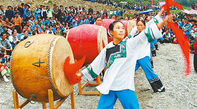 9日下午,在被誉为“天下鼓乡”的湘西德夯,2013吉首国际鼓文化节“鼓王争霸赛”激战正酣。德夯景区代表队选手杨欣,跟着边鼓的节奏,在一面猩红的苗鼓前,跳跃、旋转、击打,鼓声时而轻快清脆,时而高亢激昂,声声鼓韵,传递出苗家人的喜怒哀乐。