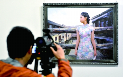 11月18日,一名记者在云南省博物馆拍摄朝鲜艺术家美术精品展。当日,“第十三届亚洲艺术节——朝鲜艺术家美术精品展”在位于昆明的云南省博物馆开展。新华社记者 蔺以光摄