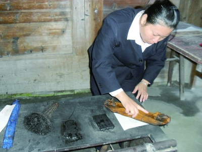 连城四堡雕版印刷基地员工正在演示印刷工艺(本报记者郭超摄)