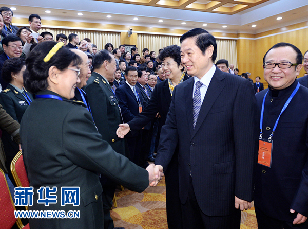 11月29日,中国电影家协会第九次全国代表大会在北京召开。中共中央政治局委员、中宣部部长刘奇葆出席开幕式并讲话。这是开幕式前,刘奇葆与参加会议的代表亲切握手。新华社记者李涛 摄