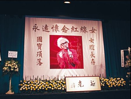 另外,红线女告别会将于今日在广州银河园主礼楼白云厅举行。礼堂中央放着女姐遗照,横匾用粉红色写上“深切怀念”。礼堂可容纳愈百人,两旁放满用白合花做成的奠字花牌,礼堂中央也架起花坛。现场见工作人员忙于预备,礼堂正准备女姐生前电影片段及大型戏曲造型照片。