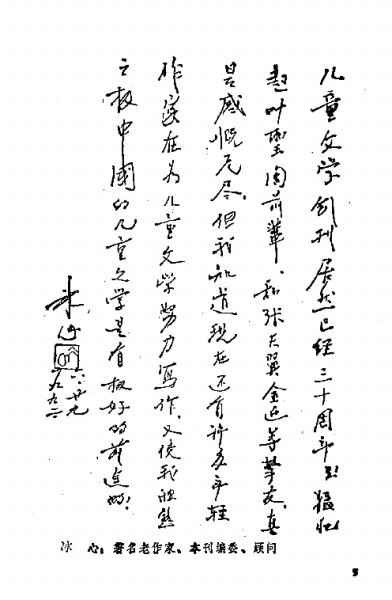 著名作家,《儿童文学》编委、顾问冰心为《儿童文学》创刊30周年题词