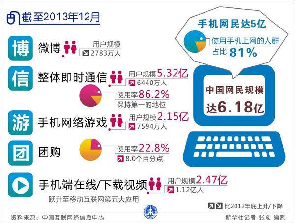 中国互联网络信息中心16日发布数据显示,截至2013年12月,中国网民规模达6.18亿。其中,网民中使用手机上网的人群占比由2012年底的74.5%提升至81.0%,手机网民规模继续保持稳定增长。
