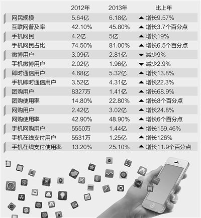 16日,中国互联网中心(CNNIC)在京发布第三十三次《中国互联网发展状况统计报告》。报告显示,截至2013年12月,中国网民规模达6.18亿,全年新增网民5358万人,互联网普及率为45.8%,其中,我国手机网民规模达5亿,较2012年底增加8009万人,网民中使用手机上网的人群占比由2012年底的74.5%提升至81.0%,手机上网依然是网民规模增长的主要动力。