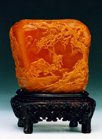 清代是寿山石雕的昌盛时期,史籍记载,雍正时寿山石雕已纳入官府的征税范围,雕刻艺术因材施艺,分别雕刻印章、文具、人物、动物及玉镶嵌各种器皿,印章的钮饰更加精致多样,表现技法上出现了阴刻和链条技法,乾隆皇帝用过的一套"宝印",就是用一块田黄刻制并由两根链条连接起来的三颗印章! 技艺高超,堪称国之瑰宝。