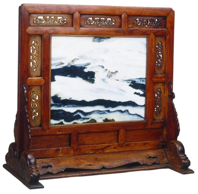 这件作为案头陈设的小屏风底座长73.5厘米,宽39.5厘米,高70.5厘米,原装有大理石板,因破碎而撤去。它如实地仿照了大座屏风的造型、结构和装饰,与故宫景仁宫大门内大如照壁的明代白石大座屏风颇为相似。在边框内的分隔中,把屏心上、下各横分为绦环板3块,两侧各竖分为两块。在墩座上做出如意云头,抱鼓上刻蕖花,安站牙。这件小座屏风造型质朴、简洁,形式合乎规矩,精致的纹饰点缀其间,与黄花梨若隐若现的纹路相互映衬,散发着幽幽古意,具有明式家具的典型风格。