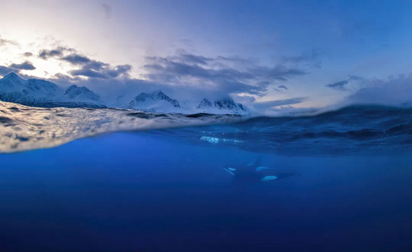 走进展厅,仿佛走进了海洋的世界,这里有海浪的声音,有鲸鱼的叫声,有五彩缤纷的深海生物,更有巨幅悬空垂下的中国风海洋主题作品。观众可以看到迎面而来的抹香鲸、冰海的虎鲸、子行母随的大翅鲸、乞讨的鲸鲨、暗藏杀机的美洲鳄……这些精彩的视频影像和摄影作品都是摄影家岳鸿军几十年来潜心于海洋摄影的创作成果展示。