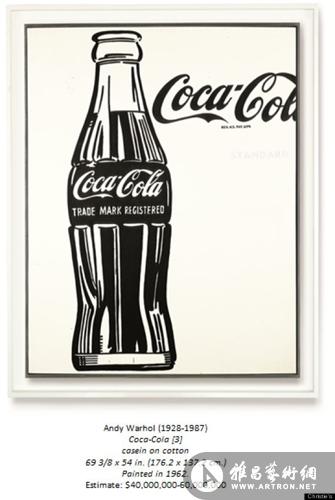 安迪·沃霍尔手绘的这幅高约6英尺的“可口可乐(3)”创作于1962年,与其后期创作的丝网版画风格不同。佳士得战后及当代艺术部国际区总裁Brett Gorvy表示:“如果你想要定义波普艺术,看这幅画就够了,因为它含有两个最具代表性的元素:可口可乐和安迪·沃霍尔。”