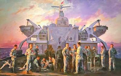 第四篇章“伟大梦想:民族复兴之路”,展示了党的十八大以来,在中华民族走向伟大复兴的历史新征程中,中国人民意气风发的时代风采和祖国建设的辉煌成就。一排排即将发动的列车重叠构成了画面的主体,错落的笔触为作品增添了细节,张静的中国画《中国速度》以充满设计感的造型方式呈现了中国高铁的发展面貌,让人耳目一新。由国家主题性美术创作研究中心团体创作的油画《G20杭州峰会:向世界传递中国声音》描绘了各国记者在会场里进行直播报道的盛况,对称的构图庄严肃穆,明丽的色彩时尚大气,画面中无处不在的中国元素彰显着大国形象。陈坚的水彩画《二零一五年九月三日》记录了2015年抗战胜利70周年阅兵的宏大场景,天空中的战机与陆军部队整齐排布,鸟瞰的视角和大面积的天空营造出开阔之感。此外,孙昌武的油画《小康之家》、李传真的中国画《夕阳颂歌》、曹巍的油画《科技创业的年轻人》等作品描绘了新时代里各个年龄阶段、各行各业的人们幸福而忙碌的平凡生活;时卫平的油画《极地考察·雪龙号驶进北冰洋》、刘伟佳的油画《穿越江河湖海——中国奇迹工程南水北调》、周吉荣的版画《贵州“天眼”》等作品聚焦新成就,讴歌新时代;周武发的油画《南海之晨》,周长春的油画《和平使命·蓝色交响曲》,萌芳、邸可新、殷亮的油画《飓风营救·澳门驻军首次“天鸽”救援》等作品则反映出新时代强军建设的成果和军人的风采。一系列的优秀作品展现了新时代我国社会主义建设的伟大进程、社会生活的巨大变革、人民群众的幸福生活和昂扬向上的精神风貌,谱写了一曲新时代的动人华章。