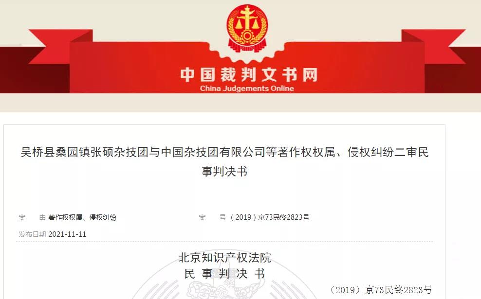 2017年,腾讯视频网站播放了许昌某电视台举办的2017年春节联欢晚会,中国杂技团认为其中的杂技节目《俏花旦》与该团享有著作权的节目《俏花旦-集体空竹》高度相似,侵犯了其相关著作权益,将腾讯公司、电视台以及表演单位张硕杂技团诉至法院,索赔10万元。作为全国首例杂技作品著作权侵权案件,该案自2018年第一次庭审起就广受业界关注。2021年11月,北京知识产权法院终审判决张硕杂技团停止侵权并赔偿损失78239元,在近3万字的判决书中,法官对杂技作品的保护范围进行了详细说明,对杂技作品的著作权保护具有非常强的指导意义。