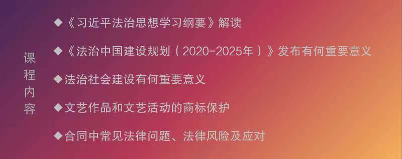 培训班注重加强对文联干部和文艺工作者的思想政治理论培训,紧密结合文艺维权工作实际需要和文艺工作者的维权需求,科学设置相关课程。培训课程详细介绍了《习近平法治思想学习纲要》的主要内容,阐释了习近平法治思想的重大意义、丰富内涵、核心要义、精神实质、实践要求。培训课程解读了《法治中国建设规划(2020—2025年)》和《法治社会建设实施纲要(2020—2025年)》对新时代更好发挥法治固根本、稳预期、利长远的重要作用。培训课程以文艺作品和文艺活动的商标保护为重点,通过典型案例讲解了商标保护对文联组织、文艺单位和文艺工作者的积极作用,提示风险提出建议。培训课程结合演出活动、文艺创作与作品传播等文联组织和文艺工作者常用合同类型,以案说法,分析了合同纠纷中常见的法律问题,并提供具体应对方法。