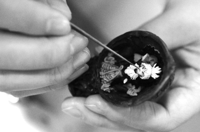 2012年12月21日,济南市第二届非物质文化遗产手工艺技能大赛开赛,125名来自山东、河南、江苏等地的非物质文化遗产手工艺人各显身手,图为一名手工艺人在核桃壳里制作面塑作品。郭绪雷 摄