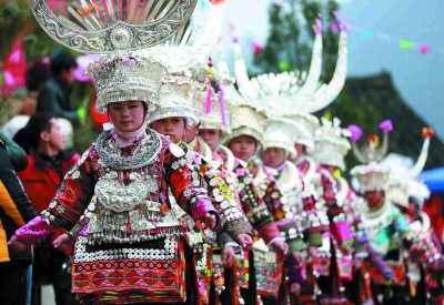 2月14日是正月初五,在贵州省丹寨县排调镇宰宿苗寨一年一度的新春芦笙会上,苗族村民身着盛装,伴随着乐曲跳起传统的芦笙舞,享受节日的轻松与欢愉。新华社发(黄晓海 摄)