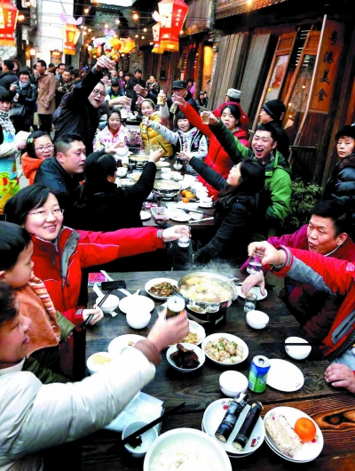 新春佳节,不少游客专程前往江浙一带的老镇寻觅久违的年味,逛庙会、长街宴、水上集市等乡村特有的新年氛围,让久居城里的人们感受到浓郁的传统新年。图为一些游客在浙江乌镇感受长街宴的红火与喜庆。新华社记者 陈飞 摄