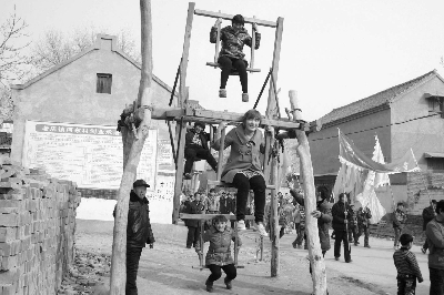 消失了半个多世纪的打车秋又出现在豫北农村。近日,在河南省安阳市滑县河东村,几名农家女在村委会旁边的打车秋上乐逍遥。