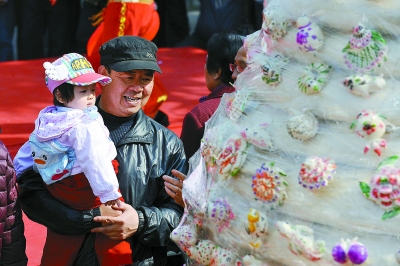云丘山花馍历史悠久,按功能可分为节庆习俗馍、人生礼仪馍和日常食用馍三大类,其造型有花鸟、瓜果、飞禽走兽等数百个品种。图为游人在太原市迎泽公园欣赏云丘山巨型花馍。