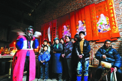 观看中村傩戏最好的时间是春节。此时,郭显椿率领的团队会走村串巷,从正月初一忙到元宵。唢呐声、锣鼓声、鞭炮声,以及五颜六色的戏服、或慈祥或狰狞的面具、或粗犷或优美的“踏罡”“踩灵”等步伐,这一切都冲击着人们的视觉。