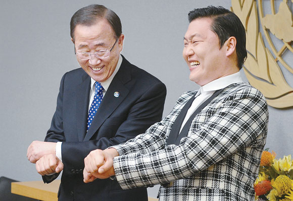 10月23日,在位于美国纽约的联合国总部,联合国秘书长潘基文(左)模仿韩国歌手朴载相(右)风靡多国乐坛的乐曲《江南Style》中的“马步舞”动作。马步舞起源于该曲MV,由其演唱者表演而出名。其基本动作为双手呈交叉握拳状、左右腿前后跳动、并且伴随手部的上下摆动。