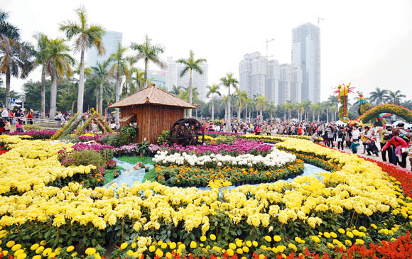 正在广西南宁举办的首届菊花展占地面积约7200平方米,用花总量约10余万盆,其中菊花近8万盆。缤纷多姿的菊花吸引大批市民和游客前来观赏。