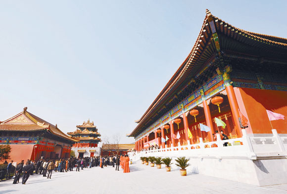 11月28日,江苏华西村重要文化工程“华西村博物馆”建成开馆,首届华西文化艺术节同时开幕。华西村博物馆由1比1复制的故宫太和殿、乾清宫、东华门、角楼和红墙等仿古建筑组成,总建筑面积1万平方米,馆内设书画馆、古陶瓷展区、工艺美术精品展区和文化艺术创作馆,珍藏、展示名家大师的字画、雕刻、玉器、瓷器、绣品、金属工艺品等万余件(套)。村里将以博物馆为依托开展系列文化活动,助推文化产业发展、“文化强村”建设,陶冶村民文化情趣。图为华西村博物馆一角。