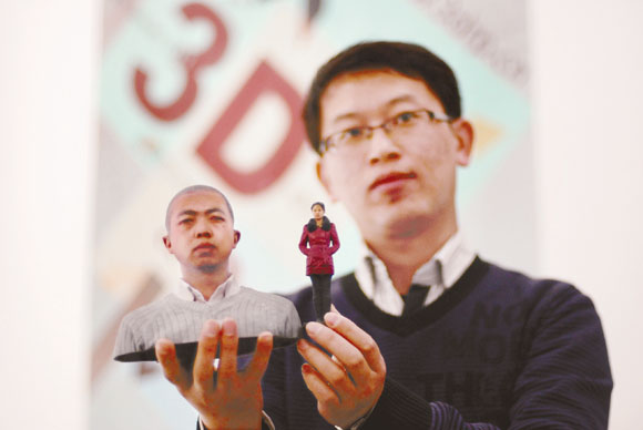 近日,一个能制作3D影像的3D打印照像体验馆在北京工业设计创意产业基地开馆。顾客只需经过十几分钟的360度扫描照相和几个小时的3D打印制作,就能够得到一个形象逼真立体的人物塑像。图为工作人员在展示已经制作好的3D人物塑像。