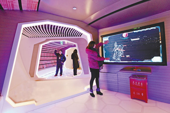 近日,上海东方明珠塔的最高球体“太空舱”经过全新改造开门迎客。东方明珠塔高468米,“太空舱”位于350米,是最高观光层。此次创新改造通过未来主义风格的空间设计来演绎太空概念,展示太空场景的科幻魅力以及我国正在开展的太空探索项目。图为游客在“太空舱”体验“星月墙”。