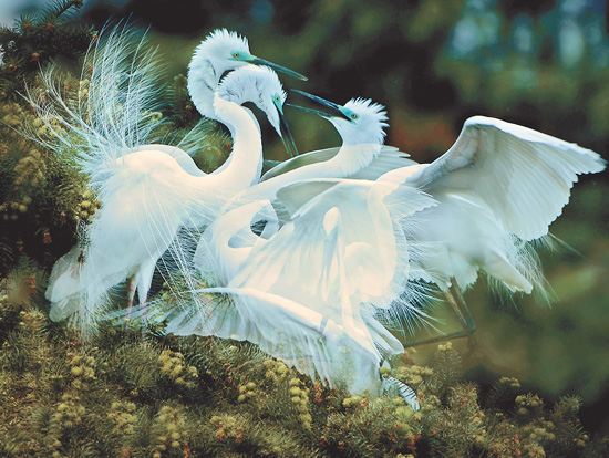 我一直对生态摄影情有独钟。多年来,我系统地拍过白鹭繁衍生息的过程,鸳鸯戏水逐波的欢快,天鹅迁徙生存的艰辛,还有许多野生鸟类的生活瞬间。其中有具象的写实,也有灵动的写意。就如中国书法有楷书和草书,中国画有工笔画和写意画。运用写实手法表现的鸟类作品就如同楷书字和工笔画一样,真实清晰,具象逼真,让人一目了然。而运用多重曝光和慢门拍摄的鸟类作品,就如草书字和写意画一样,有虚有实,若隐若现,韵味无穷,具有神秘、虚幻、抽象的空灵感,引人无限遐思。在重复的叠影和曼妙的虚影中,人们能够体会到白鹭清新豪爽,家庭和睦的情感;领略到鸳鸯淡定闲适,优雅活泼的身姿;感受到天鹅雍容华贵,志在蓝天的芳仪。技术之外,我也尽可能地以人性化的方式去表现它们,赋予它们深刻的人文精神,进而唤起人们关爱生态,呵护地球精灵的高尚意识。