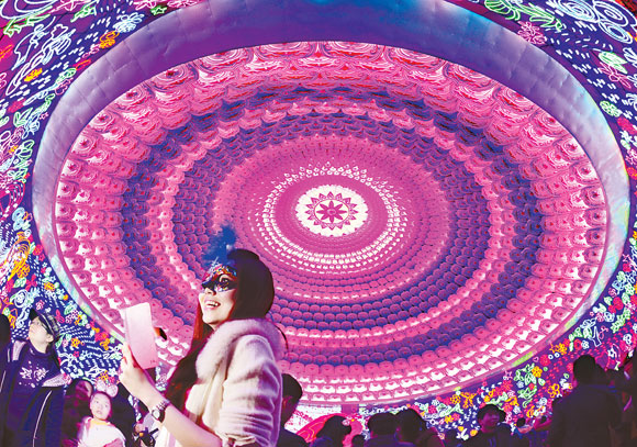 2月3日,第十九届自贡国际恐龙灯会在四川省自贡市彩灯公园正式亮灯开园。此次灯会运用高科技、新光源,打造出具有超强视觉震撼、梦幻艺术效果的“吉祥中国年”、“梦幻天穹”、“侏罗纪探秘”、“盐都印象”、“中华彩灯”和“开心城堡”六大主景区,构成创新制作的80余组各类大中型彩灯精品。图为在四川省自贡市彩灯公园里,一名女孩欣赏《梦幻天穹》灯组。