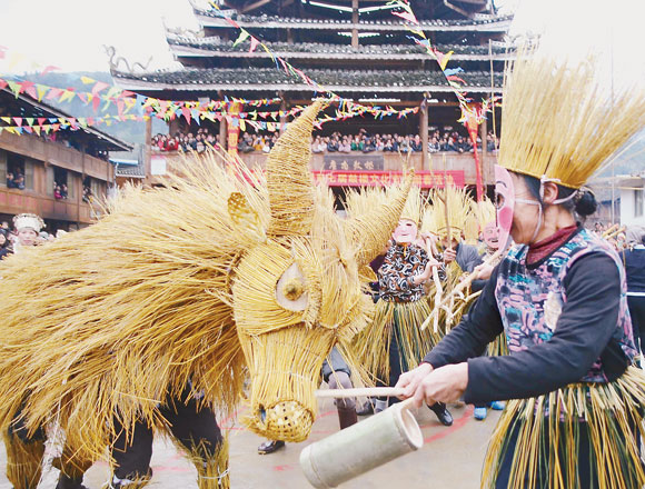 2月15日(正月初六),广西桂林市龙胜各族自治县平等乡广南村举行一年一度的原生态侗寨鼓楼文化节。当日,广南村及其周边的4000多侗族同胞身着节日盛装,汇集到鼓楼坪前,以侗族特有的闹春牛、芦笙踩堂、舞草龙草狮、原生态民族歌舞、吃百家宴等方式开展“闹春”活动,欢度春节。同时也拉开了新的一年侗寨春耕劳动生产的序幕。图为村民正在进行“闹春牛”活动。