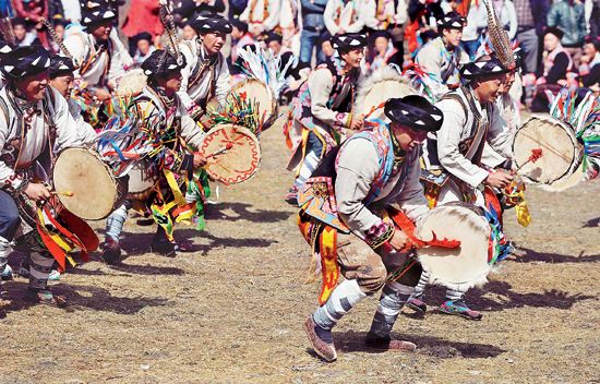 3月13日是农历二月初二,羌族传统的祭祀神灵、祈祷风调雨顺的日子,即“夬儒节”。四川阿坝藏族羌族自治州理县蒲溪乡5个村的群众,以原生态的歌舞展现古羌族人民生产生活和祭祀场景,共同庆祝传统节日。图为蒲溪乡群众表演《尔玛圣鼓》。