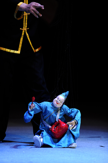 3月24日,中国福建泉州木偶剧团在印度尼西亚首都雅加达为当地观众献上提线木偶演出。图为演员在表演木偶戏《小沙弥下山》
