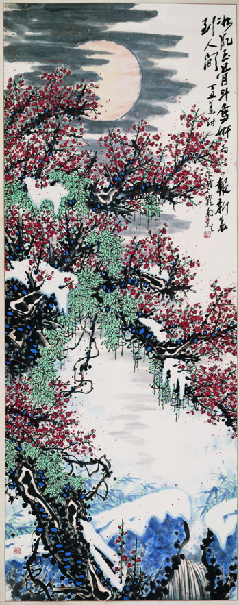 中国画师从潘天寿,其画风,是在继承潘天寿、吴昌硕艺术之长的基础上,吸收明、清以来的各大家的精华,广采博取,立足时代,努力创新,逐步锻造出沉雄博大、清新瑰丽的独特艺术风格。喜作巨帧,擅画梅、竹、藤箩等,格调深邃而高华,雄浑而清纯,苍劲而妍丽,鲜艳而典雅。苏东天擅长用笔,笔力可扛鼎,其屋漏痕、折钗股的用笔,使他笔下的线条苍劲浑厚、柔化含蓄,骨力雄强而又刚柔相济。其笔墨气韵之生动、意境之优美、内涵之丰富、境界之高古,实为古今罕见。