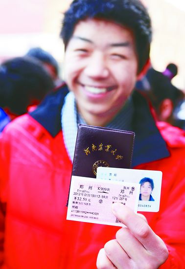 3. 1月5日,河南农业大学一名学生在学校领到火车站工作人员送来的车票。新华社发