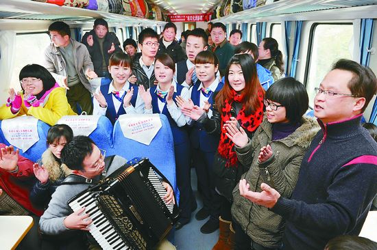 1. 成都铁路局贵阳客运段职工文艺小分队与贵阳市群众艺术馆的艺术家们登上K112次列车,在车厢内为旅客们说相声、演歌舞、写春联。图为1月6日,来自贵阳市群众艺术馆的韩树林在K112次列车上演奏手风琴。新华社记者 刘续 摄