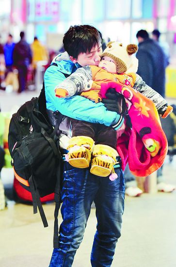 4. 1月8日,在洛阳长途汽车站候车室,一名背着行李的父亲在亲吻孩子。新华社发 高山岳 摄