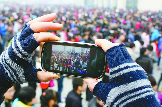 2. 1月1日,在合肥火车站广场,一名旅客在用手机拍摄购票长龙。新华社发 张端 摄