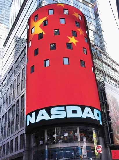 1. 美国纽约时报广场纳斯达克电子显示屏上循环显示中国五星红旗,庆祝中国龙年。新华社记者 王成云 摄