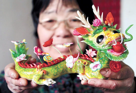 2月1日,山西省运城市闻喜县阳隅乡回坑村村民展示捏制好的“龙”花馍,迎接元宵节。新华社发 薛峻 摄