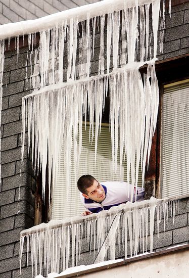 2月2日,在塞尔维亚西南部城市乌日策,一名男子从布满冰柱的窗口向外张望。 新华社发