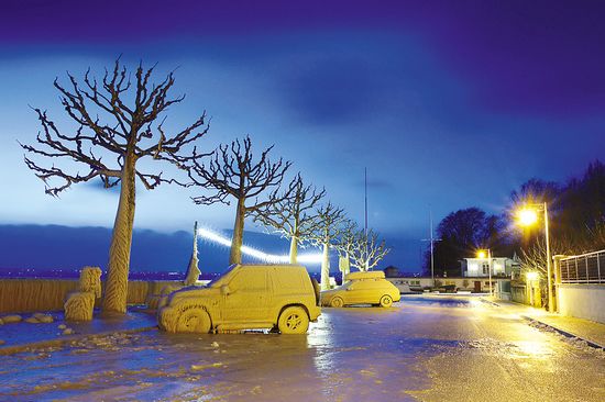 2月6日,在瑞士日内瓦湖冰冻的湖畔边,一辆汽车被冰雪覆盖。 新华社/EPA欧新