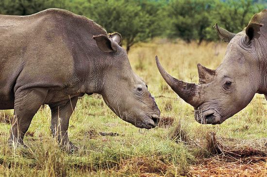 南非摄影师布伦特·斯特顿在南非科伦索拍摄的照片“犀牛之战”获得荷赛自然类组照一等奖。画面上的雌犀牛2010年11月9日被偷猎者割走犀牛角之后逃脱,现在与雄犀牛在一起。新华社/EPA欧新