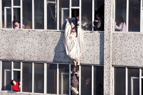 中国摄影师李杨拍摄的照片《跳楼新娘》获得热点新闻类单幅三等奖。这张照片说明为“2011年5月16日,人们在吉林长春一栋居民楼解救一名身着婚纱意欲跳楼轻生的女子”。新华社发