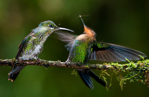 一只雌性绿顶辉蜂鸟正在向雄性绿顶辉蜂鸟吹气。摄影师:塞萨巴-托科利。