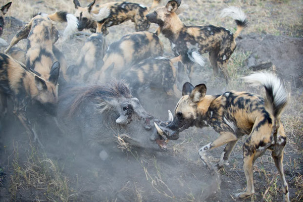 非洲博茨瓦纳北部地区,一群非洲野狗正在围攻一头非洲野猪。摄影师:苏齐-伊斯特哈斯。