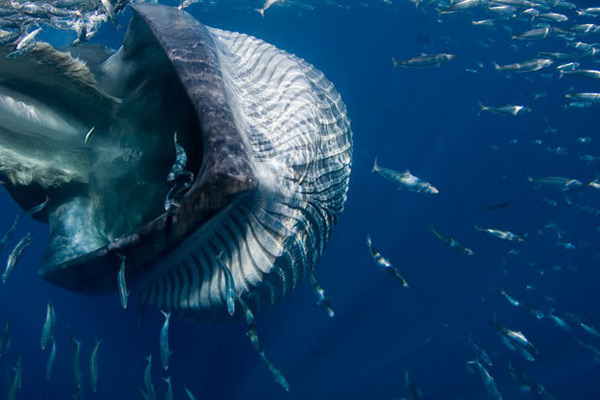 摄影师正在拍摄箕作枪鱼捕食沙丁鱼时,一头巨大的布氏鲸正以极快的速度向他游来,并张开大口将沙丁鱼吞入腹中。摄影师立即逃离,同时匆忙按下快门。摄影师虽然逃离了布氏鲸的大嘴,但他的潜水衣仍然被鲸的下颌勾住。摄影师:道格-皮尔林。
