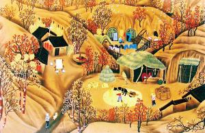关东风情,辽吉黑三省,以东丰农民画为代表的东北农民画。以长白山、黑龙江、松辽平原为标志的东北大山、大水、大平原,养育了多民族,汇集了各路闯关东的大军,东北人团结、包容,“黑土文化”造就了东北人大气魄。东北融渔猎文化、游牧文化和农耕文化为一体,形成拓荒文化、创业文化。东北人不畏严寒,不怕艰苦,粗犷豪放,勇于拼搏。东北民间艺术为农民画提供了充足养料,作品质朴率真,夸张浪漫,充满东北风情。