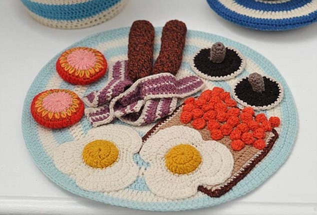 放眼望去,小屋内处处散发着温暖与新奇:累了,拉上毛线编织的窗帘,躺进毛线制成的被子里美美地睡上一觉;饿了,桌上摆放着丰盛诱人的“餐点”,鸡蛋、点心、培根随你“享用”;渴了,拿起希腊风格蓝白条纹的水壶,给自己倒一杯暖暖的水;出门前,用穿着彩色外套的电话机呼朋唤友……詹金斯用各种颜色的毛线,为我们还原了温馨的现实生活场景。