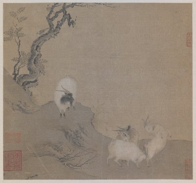 图中山羊的形态描绘准确,体现了画家深厚的写生功底,如小山羊跳跃、抵撞的姿态,老山羊前蹄收缩、双耳上竖的细部动作,甚至翻转的双角,均表现得一丝不苟,体现了宋代院体绘画精工细致、刻划入微的风格特征。全图毫无板滞之气,画家抓住表现对象的主要特征,舍弃琐碎的细节,运用不多的笔墨和写意的手法追求言简意赅的艺术效果。
